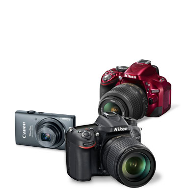 Oh Mittens, you've never looked cuter. Hold. That. Pose. Please don't move! We need a pic of this. Yes, we'll touch up the tail fluff, use red-eye removal and yes, we'll crop out the dog. Isn't it amazing what digital photography can do? We think so. And here's something else we find amazing: All of the digital cameras and camcorders available at Target. Let's focus on cameras first. For you casual snappers who like easy peasy, we've got plenty of the point and shoot types—in over ten cute colors, no less. And to the more advanced photogs who like being able to switch out your lenses and who want photos with higher quality, we offer a huge selection of DSLR models (DSLR is short for Digital SLR, and even shorter for Digital Single-Lens Reflex). We also have long zoom for pics from far-away places, and compact systems for packing into tiny spaces. And all of it comes from the biggest and best camera names like Canon, GoPro and Nikon. So our camera selection's stellar, but sometimes still shots won't cut it. For when your subject's on the move and you need audio, we have cool camcorders of all kinds—even some made especially for kids. We also have some that are super slim, some with flip-out screens that swivel, some with HD and some that come with their very own tripods. It's hard to picture a better selection.