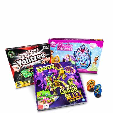 Feel like playing a game? Yay, so do we! You pick. Oh, you don't know what you're in the mood for? Target has oodles to choose from, so we'll try to narrow it down. Let's see… How about one of the classic board games like Scrabble? Or, if you're not in a spelling mood, maybe you'd like to test your economic strategy with Monopoly? We're up for a round—but we get to be the dog. Those games take a lot of thinking, though, and maybe you'd rather play something a little lighter and more fast-paced. How about dice games? Or wait, maybe card games. We have Apples to Apples, Uno, Scattegories and more, including matching games with cards about cats, dogs and even dinosaurs. And for those who like their fun to buzz, beep and blink, we have electronic games galore. There's Catchphrase, poker, solitaire, Loopz, and there's other stuff way too big to fit in your hands—stuff like air hockey tables and electronic basketball hoops. But some of those things you can play by yourself or with just one other person, and maybe you want to have a bunch of people over. That calls for party games! And while you have your friends' attention, why not show off your hocus pocus skills with one of our magic sets? But maybe you're not feeling that social after all, and you wouldn't mind some quiet alone time. For that, we recommend one of our over 250 puzzles. You'll love 'em to pieces.