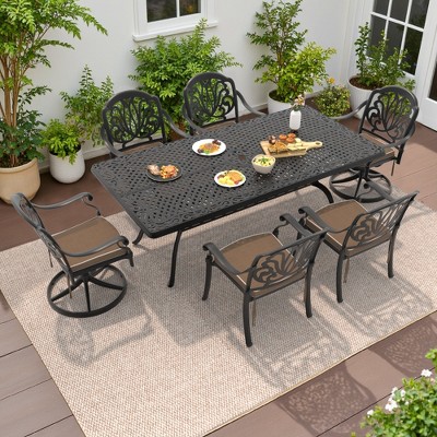 7-Piece Oval Cast Aluminum Outdoor Patio Dining Set with Swivel Chairs & Brown Cushions & Umbrella Hole