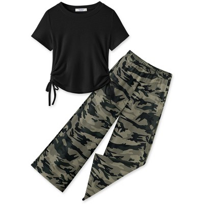Arshiner Girls 2 Piece Outfits Short Sleeve Ruched Drawstring Crewneck Tops and Wide Leg Pants with Pockets Clothing Sets-PAT23-120