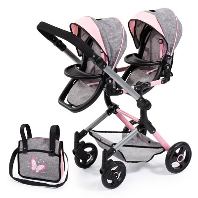 Bayer: Twin Doll Pram Neo with Adjustable Height Handle and Flexible Sun Covers, Grey Pink with Butterfly Design, Foldable and Space-Saving for Up to