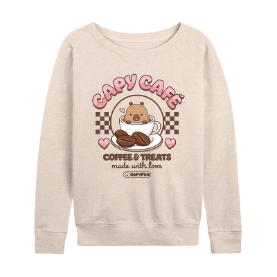 Women's - CapyFun - Capy Cafe Lightweight French Terry Wide Neck Long Sleeve Graphic Shirt