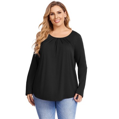 Women's Plus Size Pleated Front Long Sleeve Top - Convertible Cuff Loose Fit Blouse
