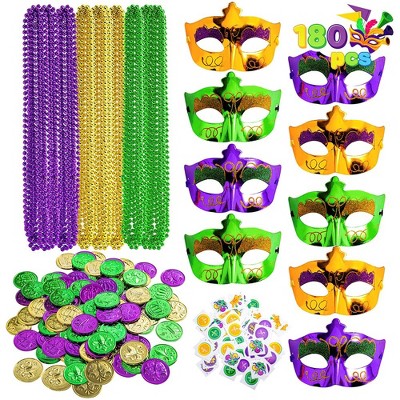 JOYIN 180 PCS Mardi Gras Party Supplies Set Serves 9 People with 9 Mask, 27 Bead Necklace, 72 Coins, 72 Tattoo Stickers for Mardi
