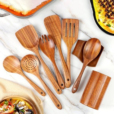Mooues 9-Piece Natural Teak Wood Kitchen Utensil Set with Spoon Holder — Comfortable Grip Cooking Spoons and Utensil Storage Rack. Housewarming Gift