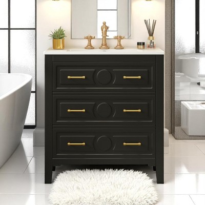 30" Bathroom Vanity with Ceramic Sink, 3 Drawers, Solid Wood Frame,Retro Cabinet, Pre-Drilled for 4" Faucet, Storage Organizer