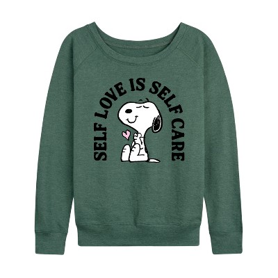Women's - Peanuts - Self Love Is Self Care Lightweight French Terry Wide Neck Long Sleeve Graphic Shirt