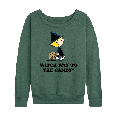 Women's - Peanuts - Witch Way To The Candy Lightweight French Terry Wide Neck Long Sleeve Graphic Shirt