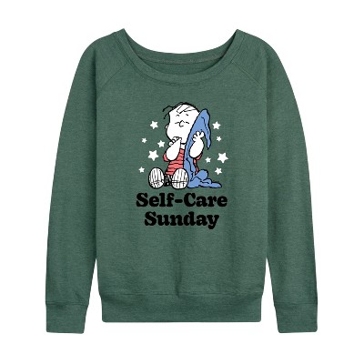 Women's - Peanuts - Self Care Sunday Lightweight French Terry Wide Neck Long Sleeve Graphic Shirt
