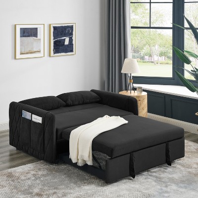 VASIP 55" Modern Convertible Velvet Sofa Bed Double Pull-Out Bed with 2 Pillows, Detachable Arm Pocket Living Room Adjustable Grid Armrests