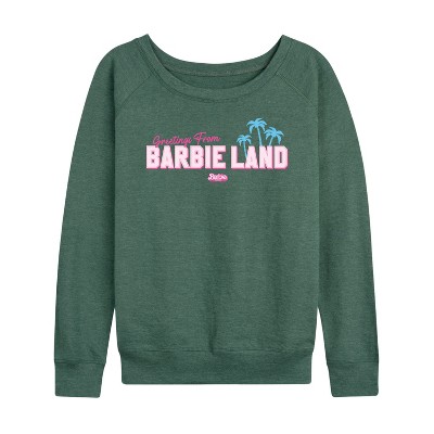 Women's - Barbie - Greetings from Barbie Land Lightweight French Terry Wide Neck Long Sleeve Graphic Shirt