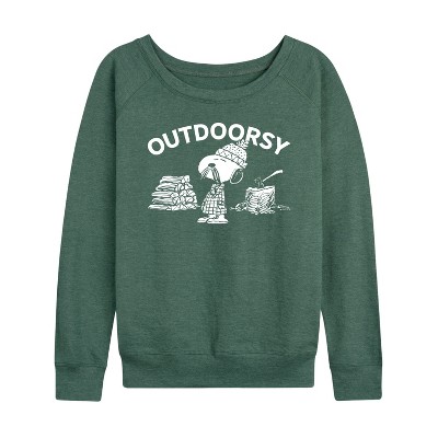 Women's - Peanuts - Outdoorsy Snoopy Lightweight French Terry Wide Neck Long Sleeve Graphic Shirt