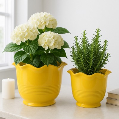 Decorative Scalloped Round Ceramic Outdoor Planters for Garden Display - Indoor Planter Flower Pots Home Decor Accent - Set of 2, 8", 6"