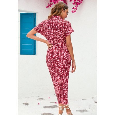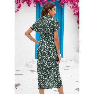 Women's Boho Floral Bodycon Short Sleeve V Neck Ruched High Empire With Tie Slit Hem Dress