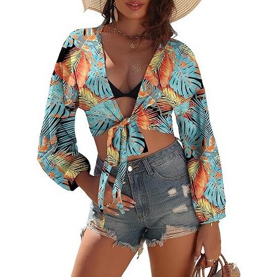 Ekouaer Women's Swimsuit Cover Ups Tie Front Long Sleeve Top for Women Bikini Shirt Summer Cardigan