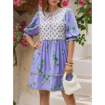 Womens Casual Floral Mini Dress Summer Puff Short Sleeve Tie Front V Neck Patchwork Loose Boho Shirt Dresses