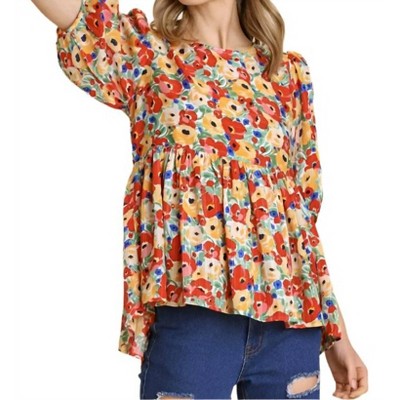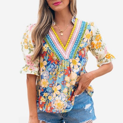 Amaryllis Women’s Multi Floral Print Puff Sleeve V Neck Embroidered Trim Lightweight Relaxed Fit Statement