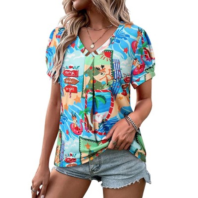 Nlife Women's V Neck Puff Sleeve Hawaiian Shirt Floral Tropical Boho Blouse