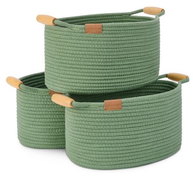 Aoibox Woven Cotton Rope Storage Basket with Wooden Handles Decorative Green Organizer 13 Inch 3 Pack
