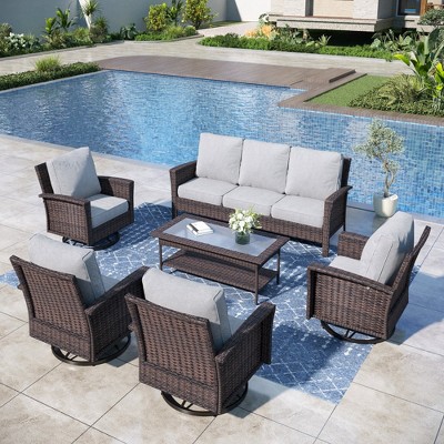 If you love the idea of a centerpiece for evening gatherings, consider patio conversation sets with fire pit tables. These combine cozy seating with a functional fire element, creating a warm and stylish hub for roasting marshmallows or sipping cocktails under the stars. For added movement and comfort, swivel chairs or rocking chairs are a modern favorite, blending relaxation with convenience.