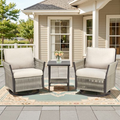 If you love the idea of a centerpiece for evening gatherings, consider patio conversation sets with fire pit tables. These combine cozy seating with a functional fire element, creating a warm and stylish hub for roasting marshmallows or sipping cocktails under the stars. For added movement and comfort, swivel chairs or rocking chairs are a modern favorite, blending relaxation with convenience.