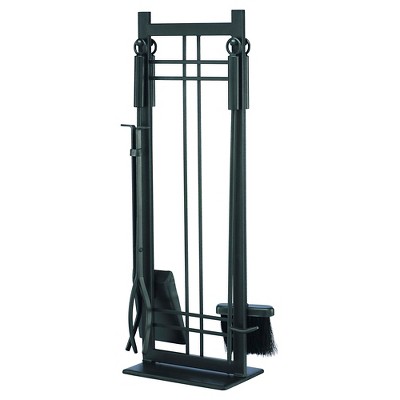 A: A standard fireplace tools set includes a poker, tongs, brush, and shovel, often displayed on a stand. These tools help you tend your fire safely and clean up afterward.