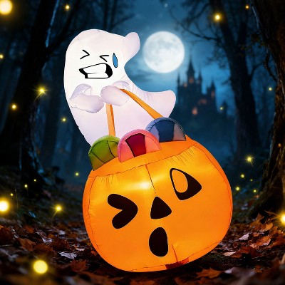 Joyfy 5 FT Halloween Inflatables Outdoor Decorations, Inflatable Cute Ghost Lift Pumpkin Candy Bag with LEDs for Halloween Yard Garden Lawn Decoration