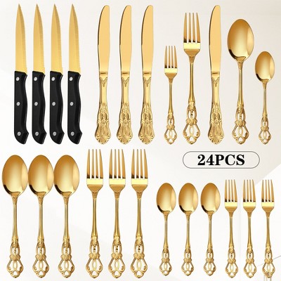 The perfect silverware elevates everyday meals into a fine dining experience. At Target, find a wide range of silverware sets to choose from. Look through a variety of silverware sets that are made of sturdy stainless steel with a smooth finish, these silverware work well in both formal and informal settings. Complete with dinner knives, dinner spoons, teaspoons, salad fork, fork tines, soup spoon, dinner forks and salad/dessert forks, these silverware sets are sure to blend in with your table setting. Ideal for families, entertaining and parties, each piece of silverware is dishwasher safe for lasting shine through many uses. Find silverware sets with an eye-catching gold finish that will instantly elevate your table setting. Browse through a large collection of silverware sets and find the perfect one for you.