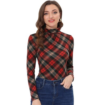 Allegra K Women's Turtleneck Long Sleeve Stretch Slim Plaid Casual Blouse
