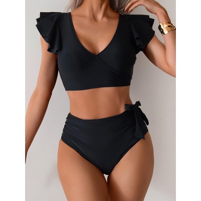 Women's Summer Color Block Bikini, High-Waisted Bottoms Two-Piece Swimsuit with Waist Bow