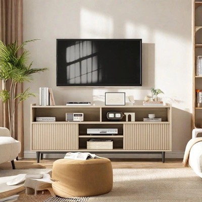 Rattan TV Stand for 75 Inch, Boho Entertainment Center with Storage and Doors