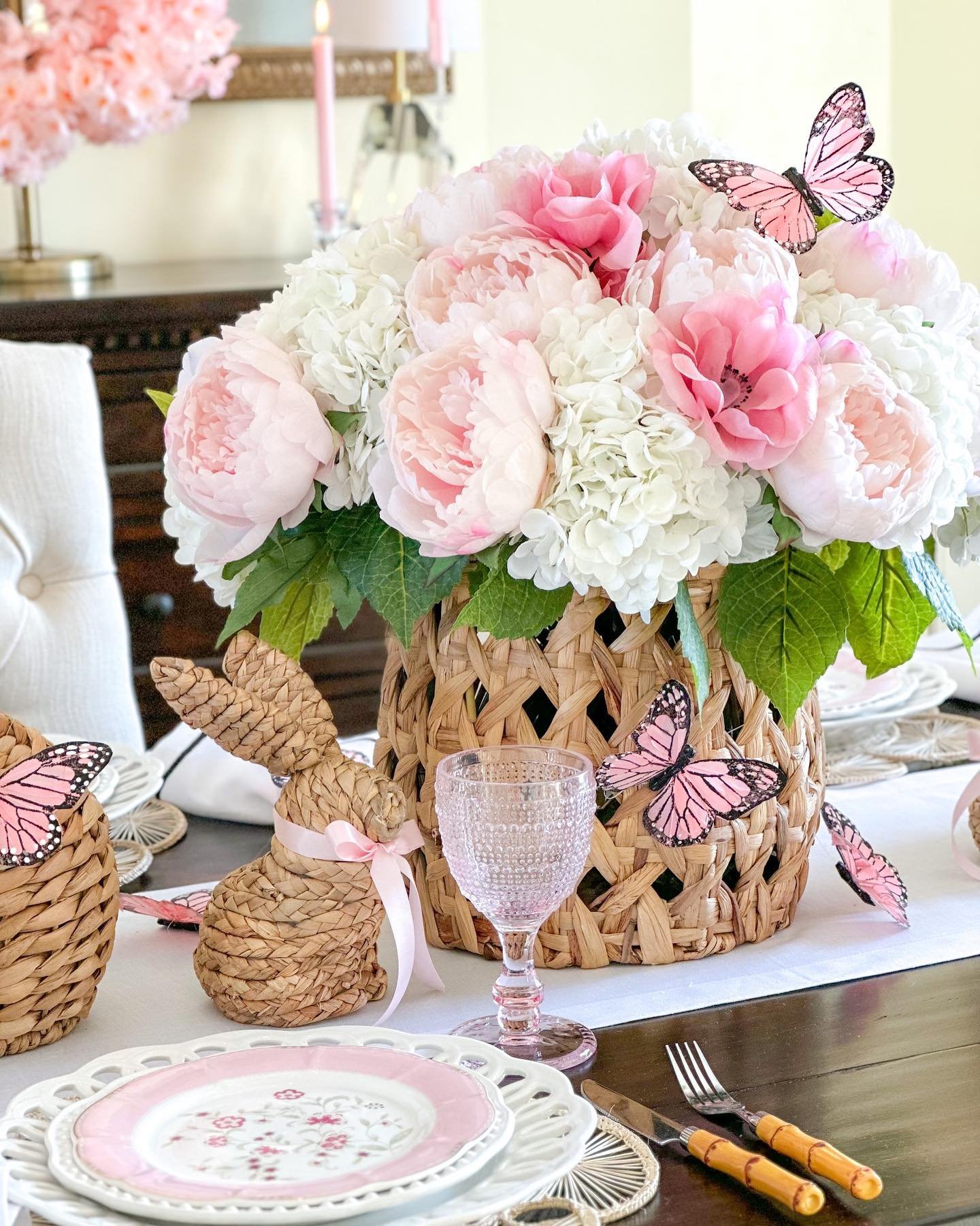 @thespilledsugar A little Easter table inspiration 🐇🦋💕 ⠀⠀⠀⠀⠀⠀⠀⠀⠀ It’s no secret that I love a little whimsy, and Easter is the perfect occasion to create a magical wonderland! ⠀⠀⠀⠀⠀⠀⠀⠀⠀ Pink monarch butterflies, woven bunnies and eggs, and a basket of flowers create a playful, enchanting setting, don’t they? I used mostly white and pink hues, but added an unexpected touch with black trimmed napkins to complement the black spots of the butterflies. I love how everything came out, and the best part? These flowers are faux, so they will look just as beautiful on Easter as they do today! ⠀⠀⠀⠀⠀⠀⠀⠀⠀ Comment EASTER below to get a direct link to shop my Easter tablescape, or you can tap on the blue link in my bio for sources. ⠀⠀⠀⠀⠀⠀⠀⠀⠀ Happy (almost) Spring! ⠀⠀⠀⠀⠀⠀⠀⠀⠀ Xoxo Laura ⠀⠀⠀⠀⠀⠀⠀⠀⠀ . . . . . . #eastertable #springtablescape #tablestyling #tablescapestylist #tablescapeinspo #tabledecor #springdecor #bunnyseason #springflorals #cottagesandbungalows #entertainandcelebrate #victoriamagazine #southernladymag #betterhomesandgardens #thecottagejournal