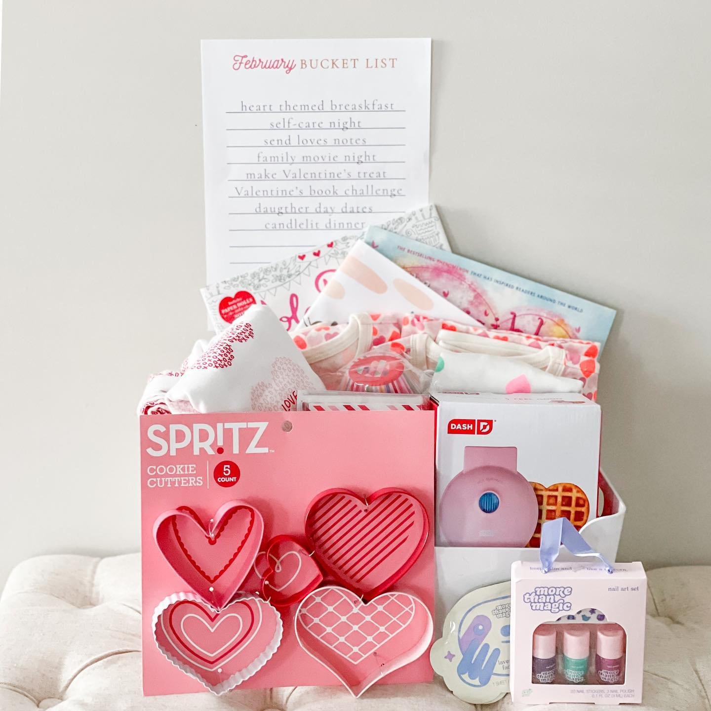 @thechrissywinchester Do you gift your kiddos for Valentine’s Day? Last year we started doing a February Bucket List with fun experiences and family time ideas for everyone to enjoy. It’s been a fun mix up to the usual small gifts for each kiddo! This year they got books, PJs, cookie cutters and treat bags, a heart waffle maker, face masks and nail polish. #lovebasket #valentinesday #valentinesdaygift #valentinesday2021 #vdaygifts #giftofexperience #familytime #lifestyleblogger #mommyblogger #targetstyle #dash #dashwafflemaker #cltblogger #charlotteblogger #charlottebloggers