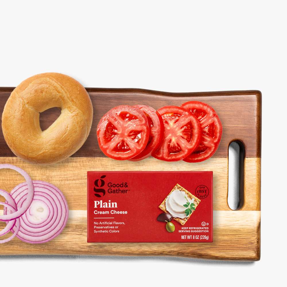 Spread cream cheese on board with fresh toppings & bagels or crackers for a soft or crunchy bite.