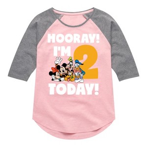 Mickey & Friends - Hooray I'm 2 Today - Toddler And Youth Girls Raglan Graphic T-Shirt - Add a touch of magic to your wardrobe with this graphic apparel featuring iconic Disney designs. Showcasing beloved characters and classic imagery, each piece combines nostalgic charm with modern style—perfect for Disney fans of all ages. Whether you're headed to the parks or just adding whimsy to your everyday look, these graphics bring the magic to life.