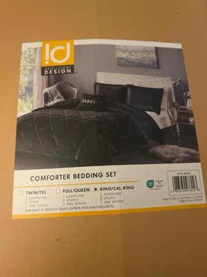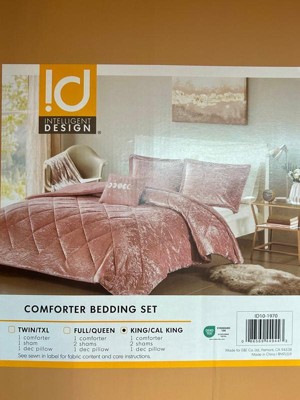 Create a luxuriously comfortable and lush bedroom space with the Intelligent Design Felicia Velvet Comforter Set. The crushed velvet, black comforter features a quilted diamond top that adds dimension to the glamorous look. Matching shams (1 for Twin/Twin XL Sizes) coordinate with the velvet comforter, while an oblong decorative pillow provides the perfect finishing touch. Hypoallergenic polyester filling in the comforter and decorative pillow provide exceptional warmth and comfort. Machine washable for easy care, this velvet comforter set brings incredible softness and comfort with a glamorous flair to your bedroom decor. Items in the set may come in a rolled or compressed packaging, which will need to be fluffed up or steam ironed before use to remove wrinkles.