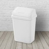 Securely staying upright for your convenience, the lid opens effortlessly with just a touch. Its swing-in feature facilitates easy disposal, complemented by a discreet bag-hiding rim for a tidy look. Built for durability, the wastebasket is designed to withstand the demands of day-to-day use in busy rooms. The contemporary design, square profile, and sleek lines effortlessly enhance any home decor, while the classic white color adds a touch of sophistication. Its mid-sized capacity is perfect for high-traffic areas, accommodating a standard 8-gallon trash liner. Crafted from easy-to-clean plastic with a textured surface, maintenance is a breeze. Versatile and stylish, it's the ideal solution for spaces like the kitchen, bathroom, bedroom, dorm room, mudroom, or basement.