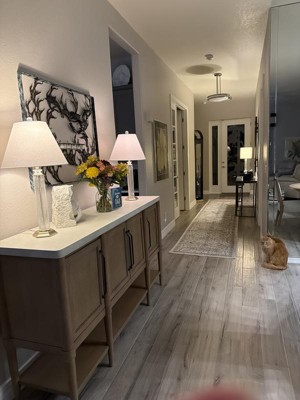 The chosen living room rug and hall runner completed the living room decor to give it an inexpensive more updated colorful appearance. The rug enhances and draws together all the colors in the room. Love it!