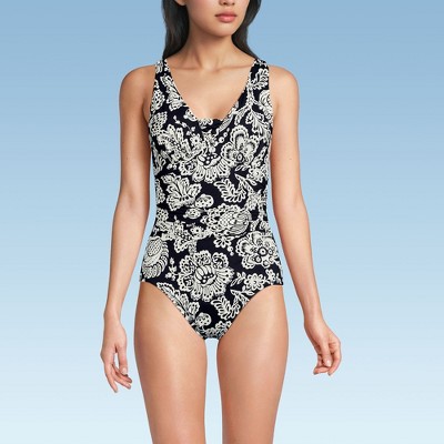 Lands' End Women's Long Torso Tugless Low Leg One Piece Swimsuit - 16 - Black/White Vine Floral
