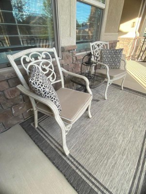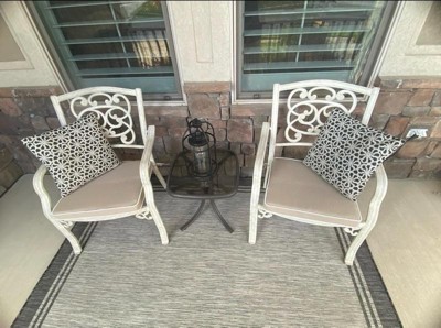 [This review was collected as part of a promotion.] I was due for new cushions as my last pair was faded. These are a nice neutral color. They came in a completely flat package, but puffed up nicely. The ties are long enough to get around almost all furniture. The fabric looks as though it might be water resistant, which is also nice. Since the color isn’t flashy, I imagine it will not fade like the others did. Very happy to have received these..