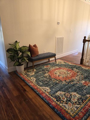 Perfect rug! The colors are vibrant. It definitely needs rug tape or a nonslip mat if putting on top tile. It really added the pop of color this room needed.