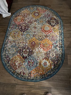 Very happy with this hard to find oval rug. It arrived timely and in perfect condition, the colors are just as pictured, including having a border that lends sophistication to the rug. It laid flat right away, following the instructions.