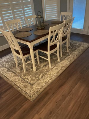 I purchased this rug to go under my dining table. It’s better than what I expected. The creams and browns and grays go really well together. It took about a day to completely lay flat but that was also with my dining set sitting on it. You won’t regret this!