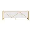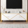 • This TV stand’s most striking feature is its golden metal framework, which serves as a glamorous highlight on either side, providing a stylish, symmetrical balance to the structure and standing out against the overall color of the piece to create a bold contrast that catches the eye.