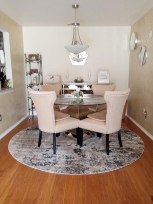 My 7'10" found Liezig area rug looks beautiful in my dining area. The table is round and I feel that the same-shaped rug compliments the furnishings. I purchased the non-slip rug and there is no movement of the rug. The dining chairs glide over the rug allowing my guests the ease of pulling out their chairs. I also purchased a 7'10" square rug for my living room area and being it is an open floor plan everything just comes together. Thank you Rugs Com for the as-promised 2day delivery and I am now enjoying both rugs!!!