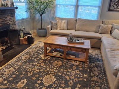 We couldn't be happier with our rug. Usually skeptical about online orders due to color differences or quality, but in this case the color and quality is great The blue makes our couch pop and adds more character to our living room The rug itself is great quality and feels so soft on our feet Great Rug for Great Price