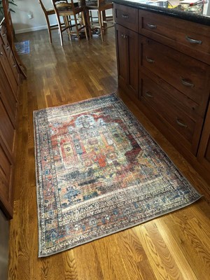 The colors on this Washable Maahru Rug (sku 6389318) are just as pictured on the Rugs.com website: vibrant, multi colored, detailed. The colored pattern gives a fun, happy vibe. It arrived on time, tightly rolled, with no fold lines. It rolled out nice, flat, and even. A 3 x 5 rug mat underneath keeps the rug from sliding on the tiled floor. This was my 1st Rugs.com purchase and I’m so pleased with the website shopping experience, the price, and the rug itself.