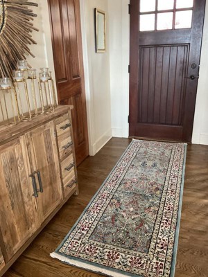 This rug is far better than pictured. It is for a galley kitchen and the rug I had there was just gross in after years, I had a specific size and wanted green, This rug is blue/green. Anyway, it looks grear and has a beautiful pattern that I did not even notice. before I bought it. One of my better online purchases.