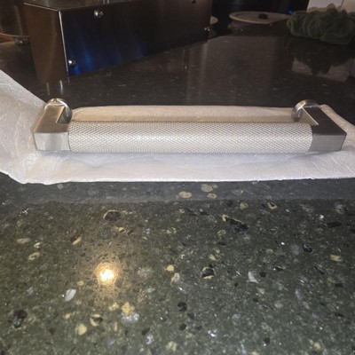 [This review was collected as part of a promotion.] This heavy duty pull is well made with a satin nickel finish. It gives a rather industrial look with the knurled design which makes it easy to grab. Easy to install with 2 sizes of screws in case the usual length is too short.
