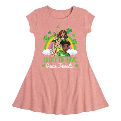Barbie - Girls Will Save the World - Barbies Holding Hands - Toddler And Youth Girls Fit And Flare Dress - Step into the glamorous pink world of Barbie with our officially licensed graphic garments for the fashion-forward! Whether you dream of being a fashion designer, a mermaid princess, or a world-traveling explorer, our garments bring Barbie's world to life with vibrant colors and playful prints. Crafted with quality materials and attention to detail, each piece ensures comfort and durability for all-day play. Express your unique sense of style and imagination with our exclusive Barbie graphic apparel!